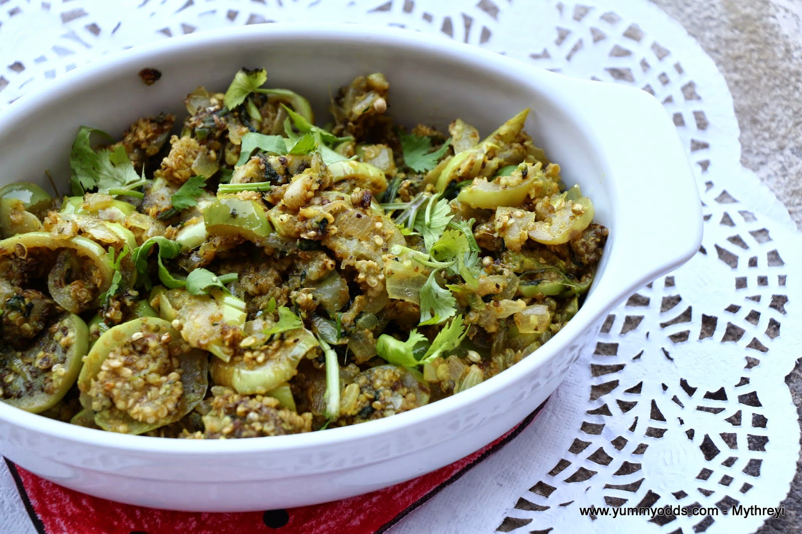1. Trim the stem edge and cut the eggplant into round circle and saute them in 1 Tbsp of oil until soft. Keep them aside.2. Take the same nonstick pan that you have sauteed eggplants before, add 1 tsp oil to it. Once the oil is hot, add thinly sliced onions to it, saute until onions become translucent.